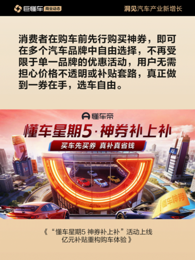 作为懂车购日常直播活动的补充,“懂车星期5 神券补上补”活动整合懂车帝、抖音双端核心资源,通过双端直播账号矩阵、懂车帝端内黄金展示位、海量汽车达人及专属社群等多元阵地,全方位触达潜在购车人群,并增加大额神券、限时秒杀券等多重福利,给到用户更多平台补贴。