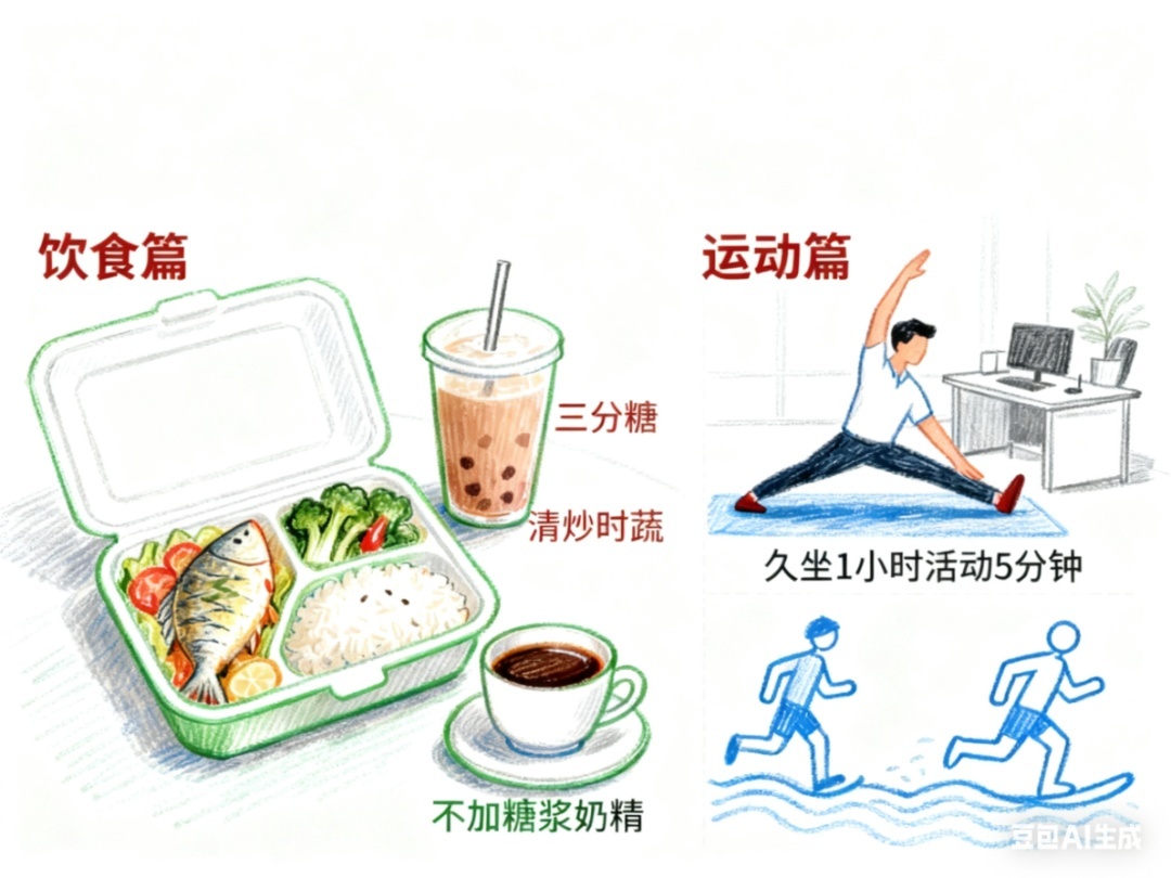 久坐1小时起身活动5分钟,做拉伸、踮脚等简单动作;每周累计150分钟中等强度运动,通勤时提前1站下车步行,周末安排快走、游泳等有氧训练。