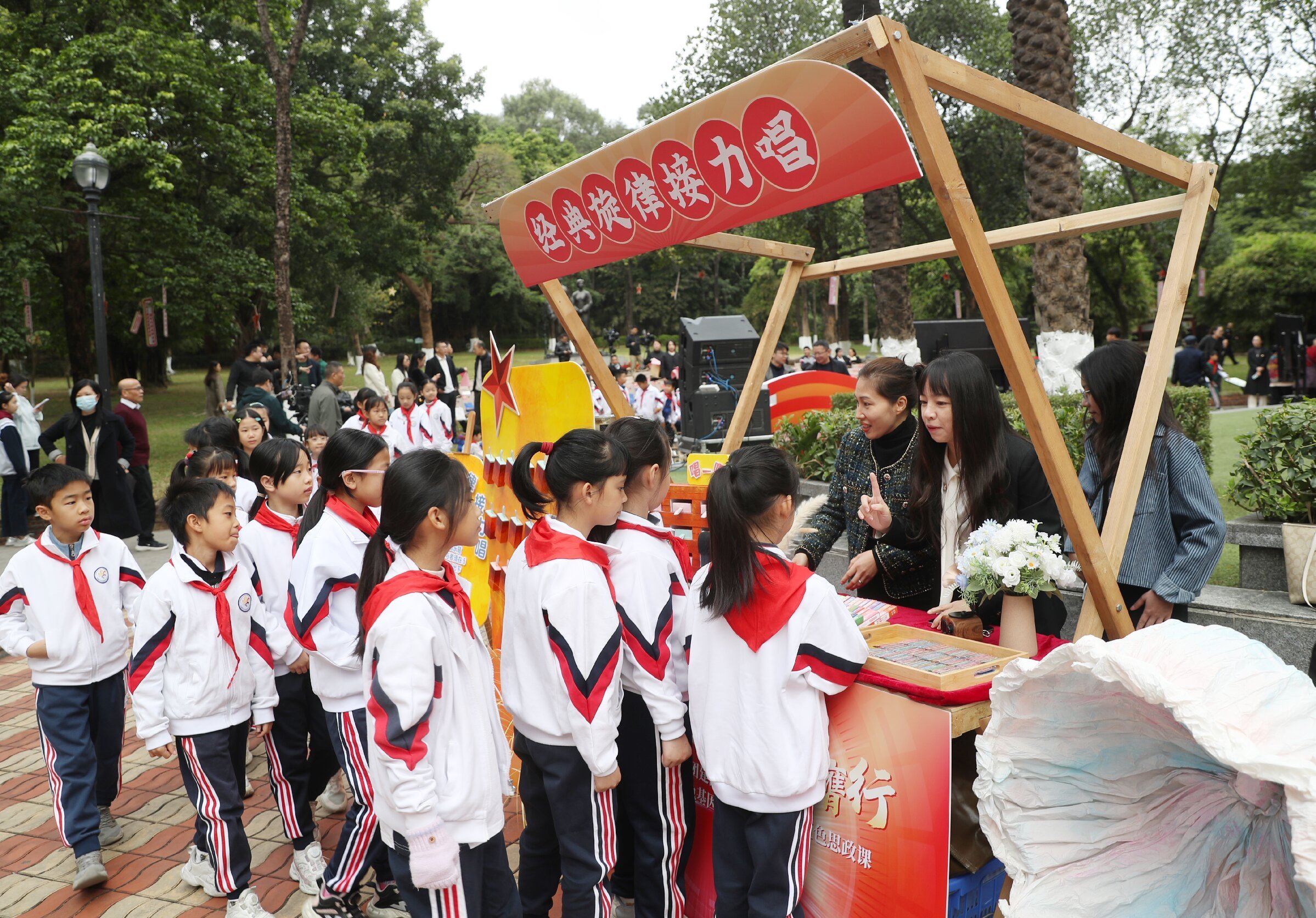在活动互动区,同学们踊跃参与知识问答、接力唱红歌、诵读爱国诗篇等红色体验活动,在趣味互动中回溯叶挺、李秀文参与革命的主要历程和关键细节,重温英雄故事、感受红色文化。其中,由乌沙小学设计的红色地标拼图游戏颇受欢迎,同学们仔细比对一枚枚拼图,很快拼凑出各个红色地标的全貌。